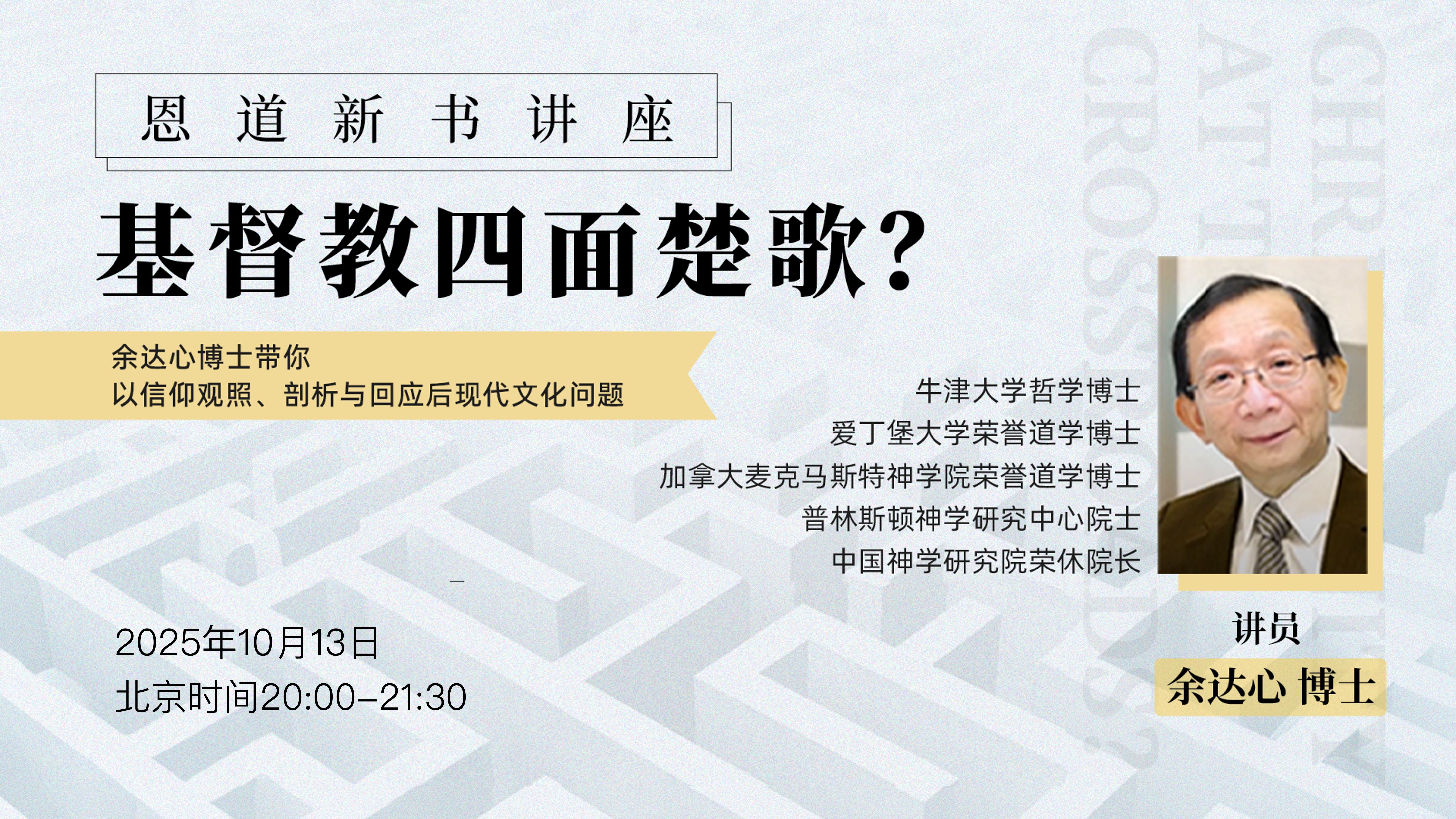 这是一个危机的时代,人工智能正热腾腾地将”美丽新世界”变成现实,人的特质和生活世界却受到前所未有的冲击:人与人疏离,市场经济塑造消费人格,理性失陷,反智流行,价值混乱,自然生态危在旦夕。这些文化趋势也正在不可避免地冲击基督教信仰。面对眼前的文化现实,基督徒如何才能不随流而去?如何与当代思潮对话而不退缩,透析文化危机的根本以作出批判,将信仰化成文化更新的资源? 欢迎观看恩道新书讲座《基督教四面楚歌?》,资深华人神学教育者余达心博士将带您深入思索后现代文化问题,以信仰观照、剖析与回应。